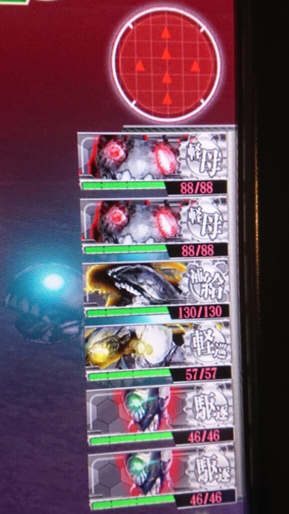 ・攻撃パターンは航空攻撃(追尾サークル×2)のみ、加えて随伴艦は砲撃と雷撃を行う
