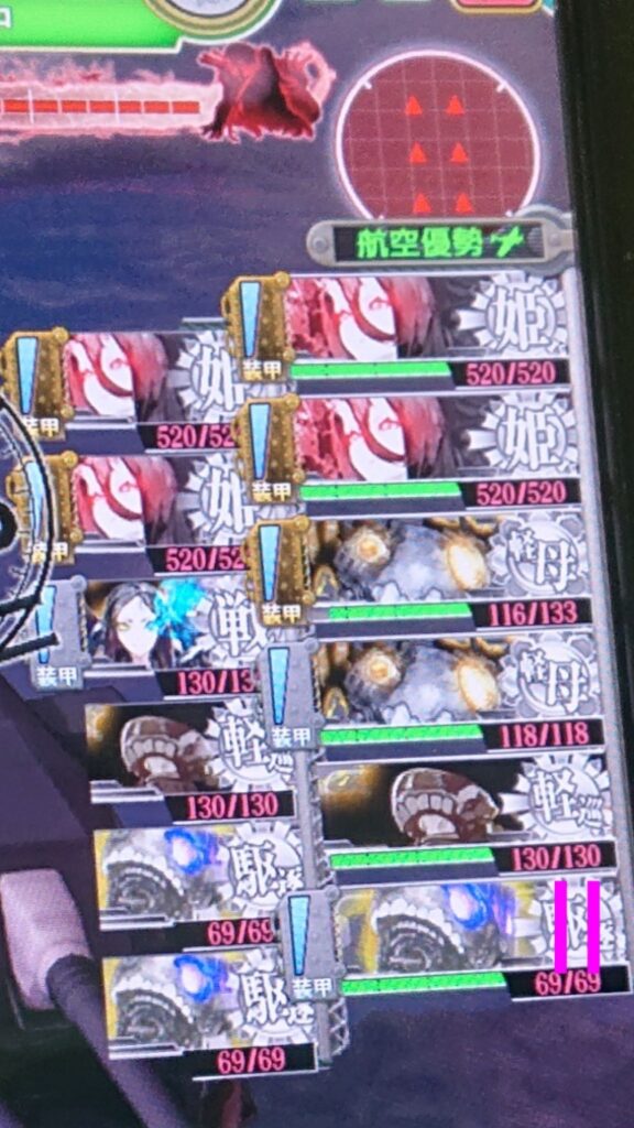 ・ゲージ破壊時は主力艦隊旗艦と随伴艦隊旗艦の「戦艦棲姫」同時撃破が必須です、最短2回撃破で海域クリアとなります