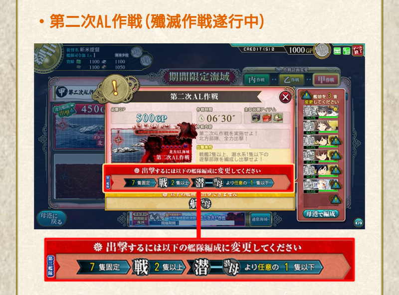 ・「北方海域最終決戦!第二次AL作戦」各種海域では航空攻撃のリロード時間が大幅に延長されます