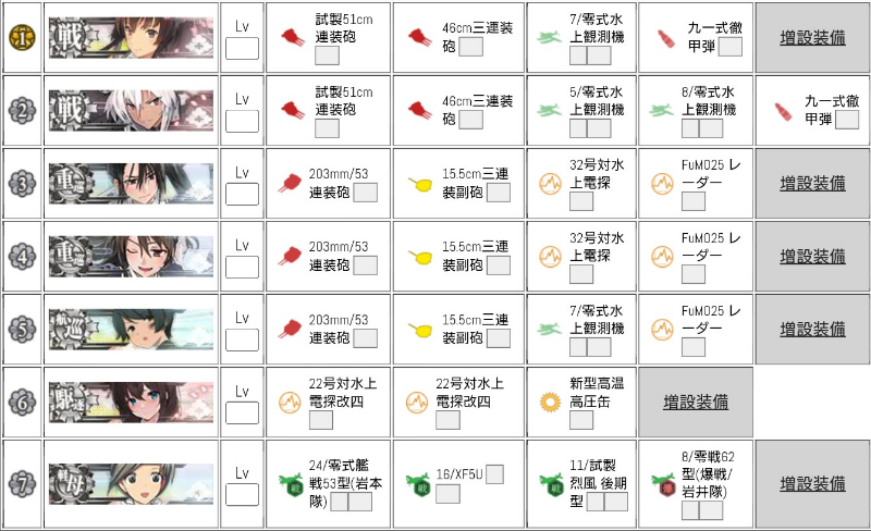 特殊砲撃を3セット採用した編成で基本構成は大和/武蔵/那智/足柄/最上/時雨+軽空母1、特殊砲撃が無いと旗艦同時撃破が非常に困難なので複数セット採用推奨になります、またこちらはボス制空値が不明なため仮置き編成です