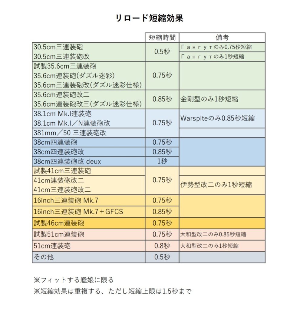 ※フィットする艦娘に「GFCS Mk.37+5inch連装両用砲(集中配備)」「Bofors 15cm連装速射砲 Mk.9 Model 1938」1基のみ搭載かつその他フィット砲0の場合に限り、例外でリロード短縮が0.7秒程度になる