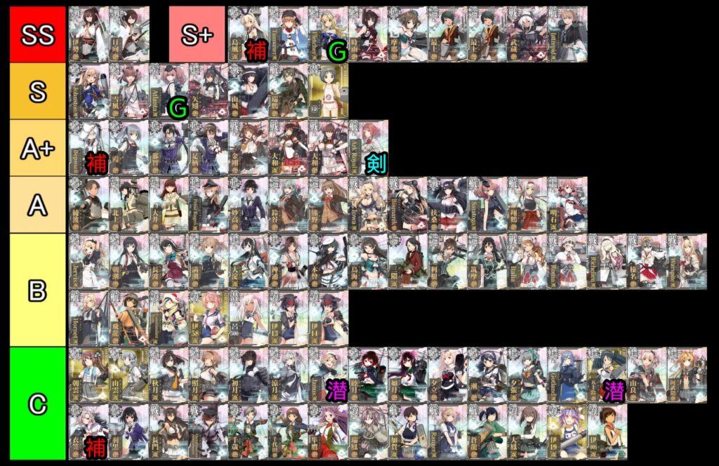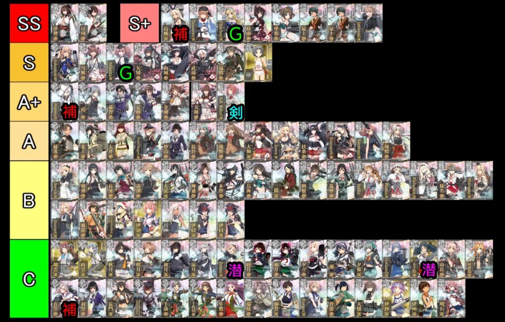 この記事におけるランク分けは「艦娘の性能」「汎用性」「唯一性」「使用頻度(特にイベント海域)」が主な基準となっています、ただし「燃費」「史実艦特効」などは考慮していません
